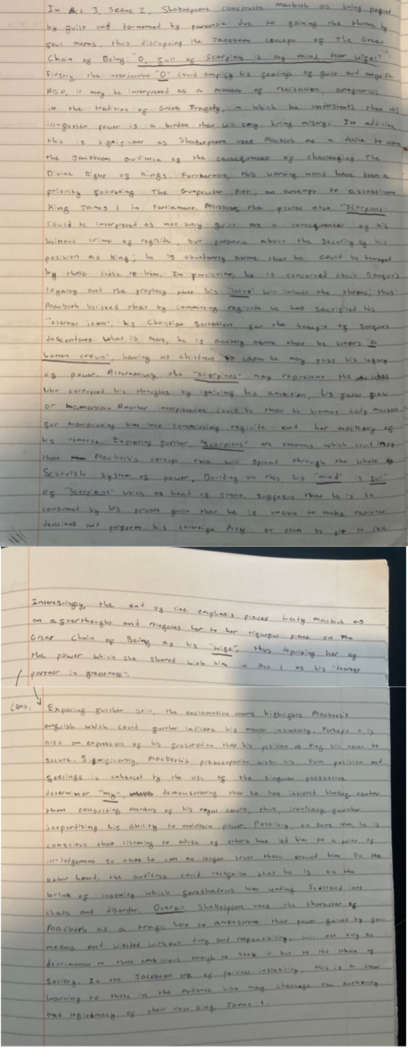"Your essay demonstrates a solid understanding of Macbeth's psychological turmoil and the context of the Jacobean era. You effectively explore key ideas around guilt, paranoia, and the consequences of ambition. However, there are areas where clarity, coherence, and grammar could be improved to enhance your argument and its delivery.